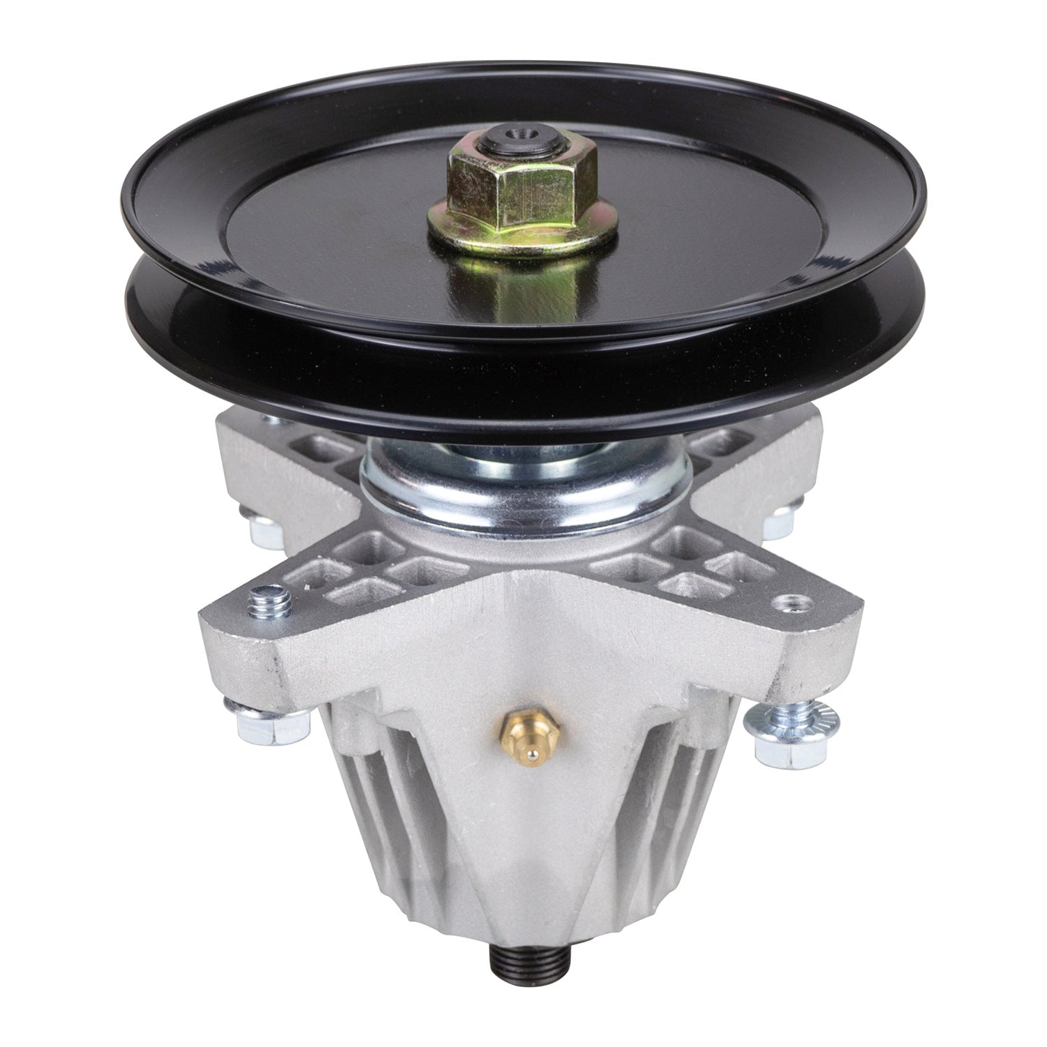 Replacement deck spindle assembly with pulley and grease fitting for selected 42" mower decks.